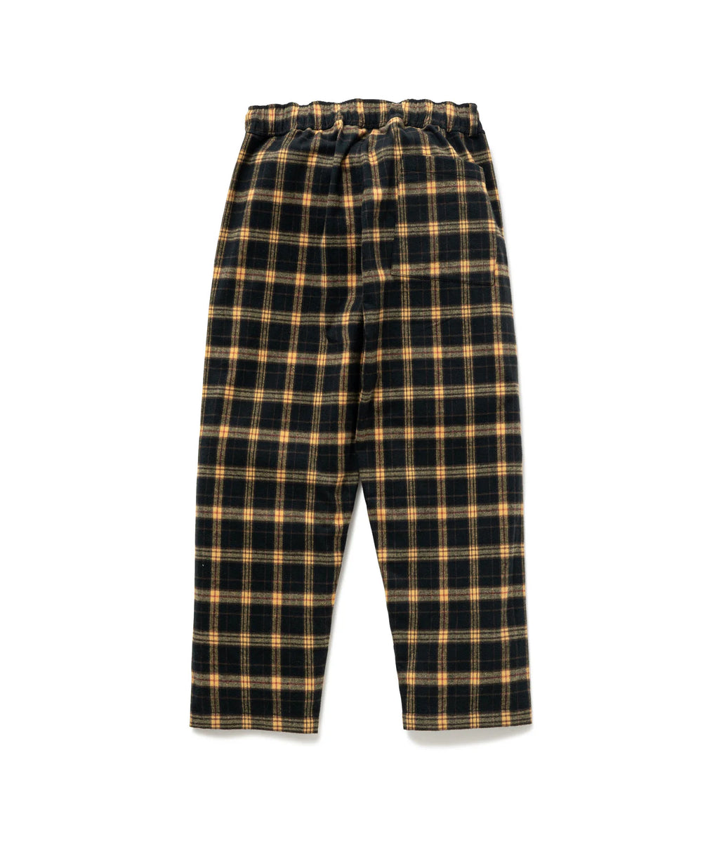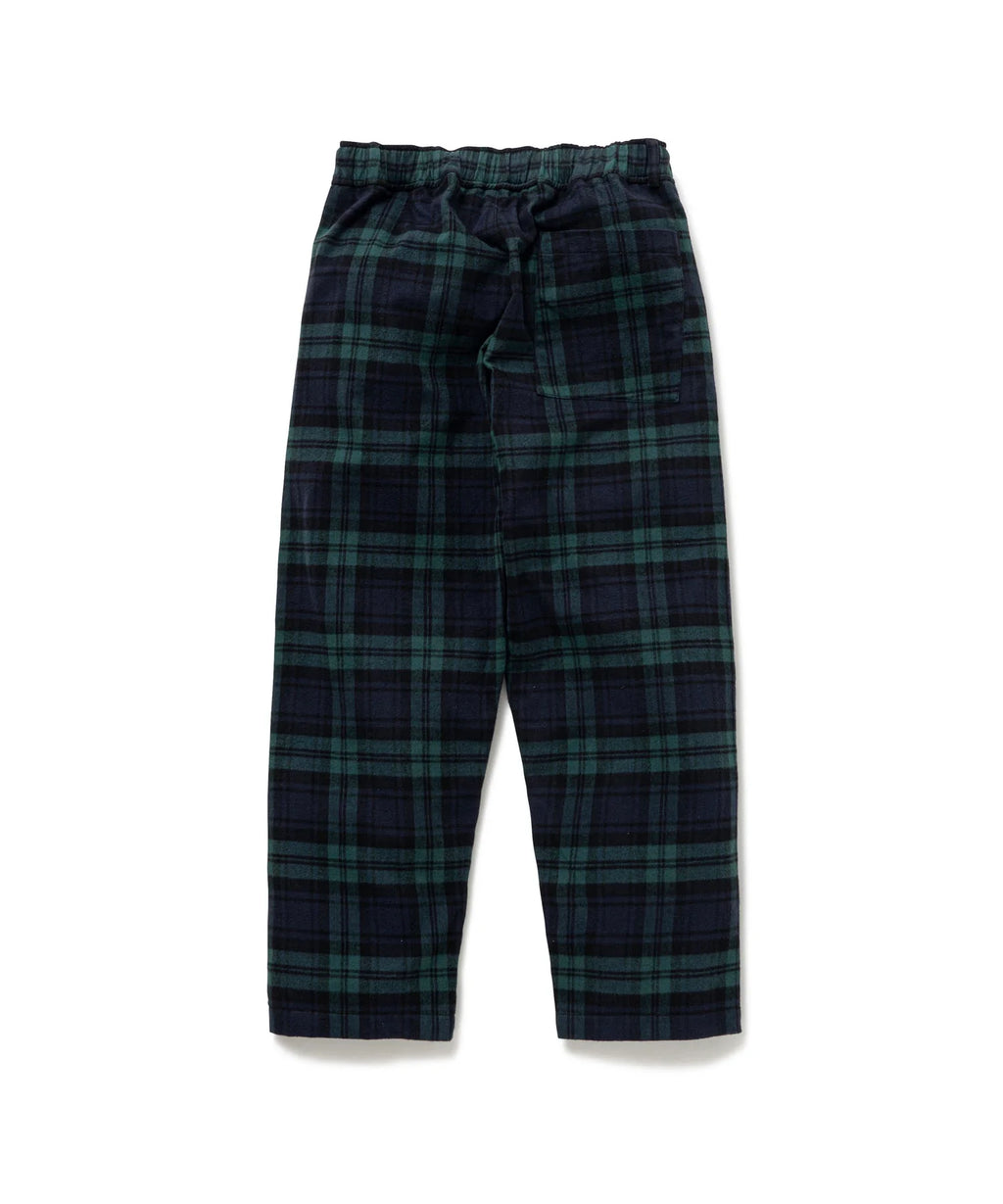 複雑で味わい深い色合いが魅力の、2色以上の霜降り糸を使用したメランジ調に織られた毛足のあるネル素材を使用。パジャマとして着用することはもちろんのこと、イージーパンツとしても着用ができるように仕上げている。右後ろ身頃にパッチポケットを採用し、ウエストベルト部分にウォレットチェーンなどをつけられるように共地ベルトループを配置している。
