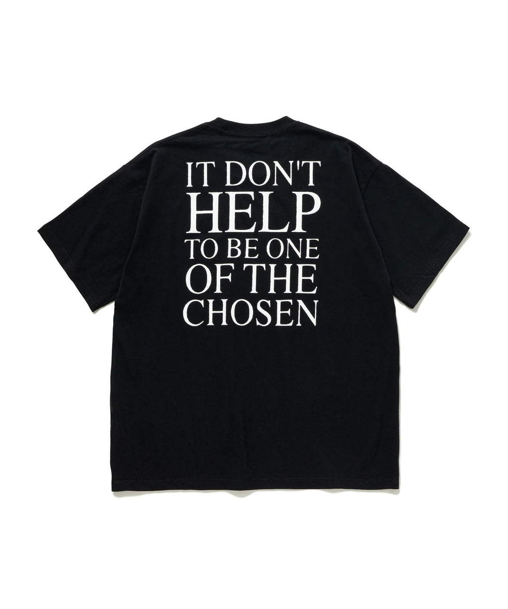 1980年代にイギリスで結成されたゴシック・ロックバンドへのオマージュTシャツ。フロントには教会の祭壇をイメージしたモチーフをプリント。バックには某バンドのキャンペーンより引用したメッセージをプリント。彼らの特徴の宗教的テーマを反映したビジュアルに仕上げた。ボクシーでゆったりとしたGOATボディー使用。ブラックのみの展開。