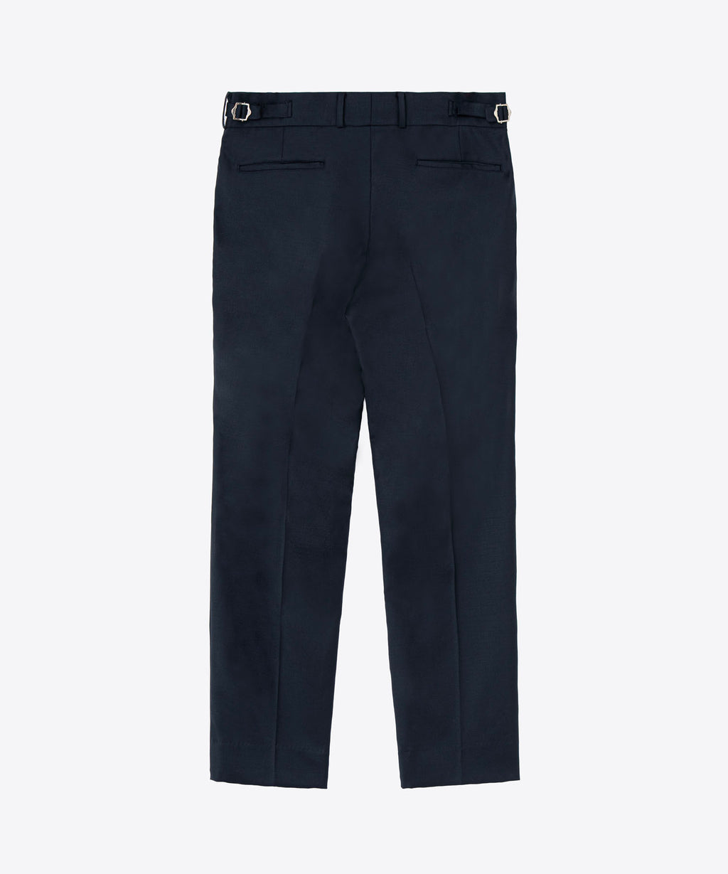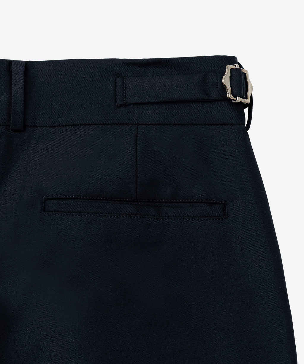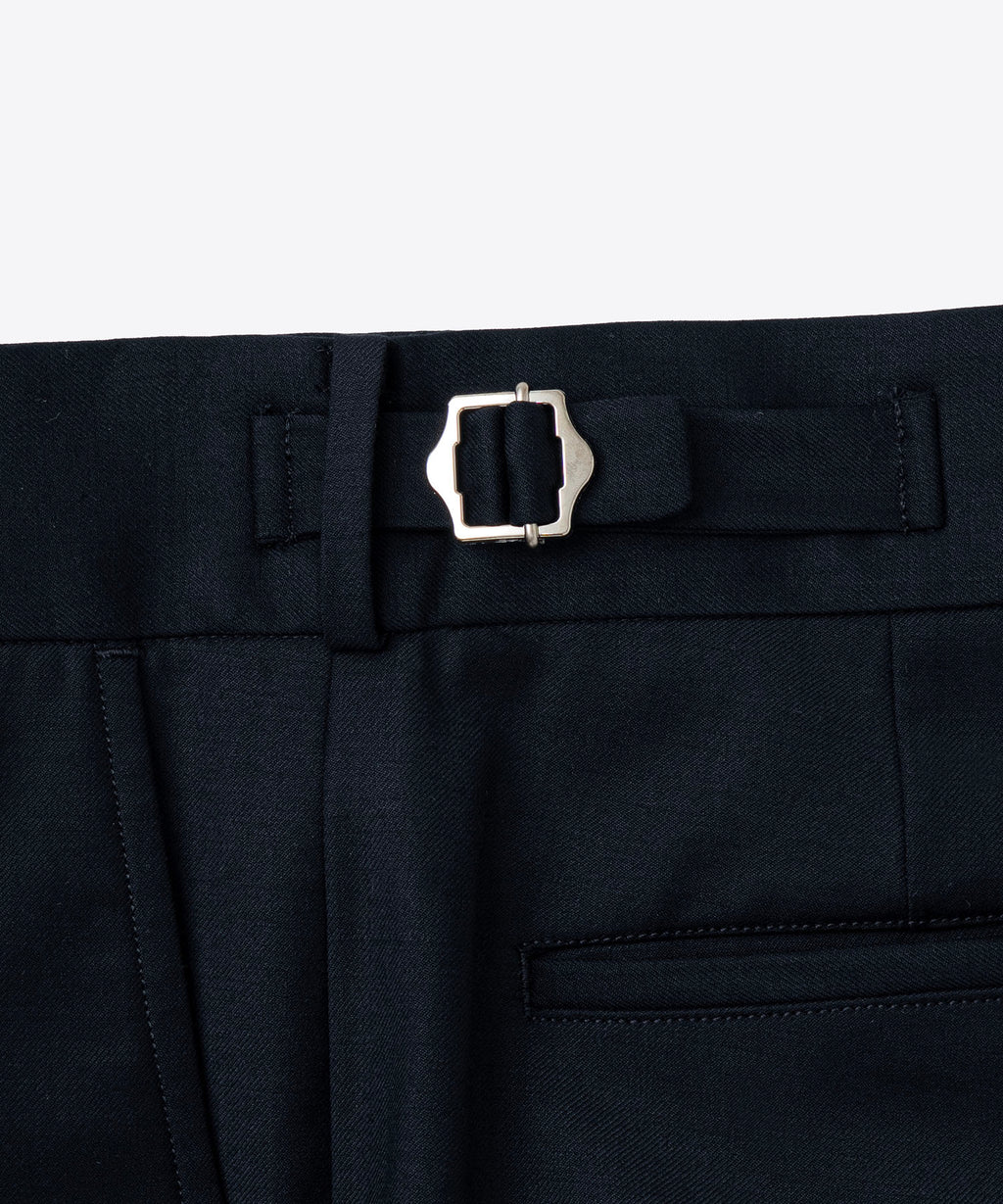 イギリス空軍のために作製されていたテーラーパンツをアップデート。BEDWIN定番の『THUNDERS』よりわたりと膝巾を約2cm小さくすることでスリムに見えるように調整。両脇に配置したアジャスターを絞ることで腰回りを微妙に調整が可能。しなやかで滑らかな光沢感が贅沢なSUPER110ウールとシルクをブレンドした糸を採用した生地を使用。