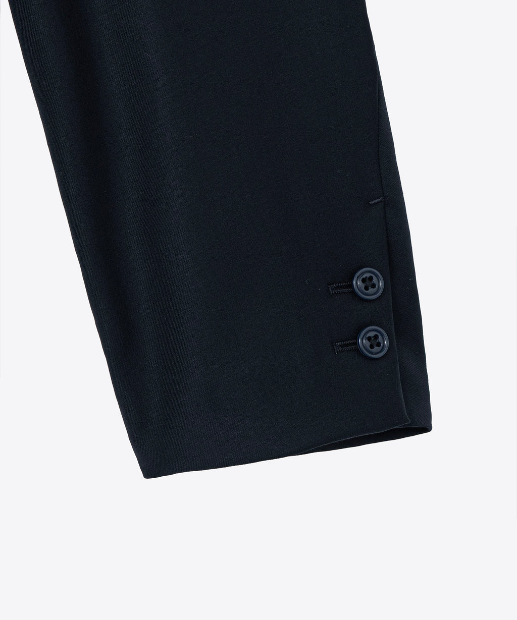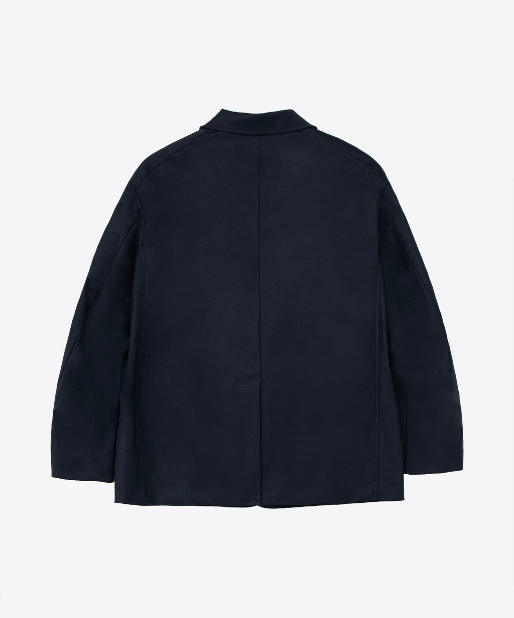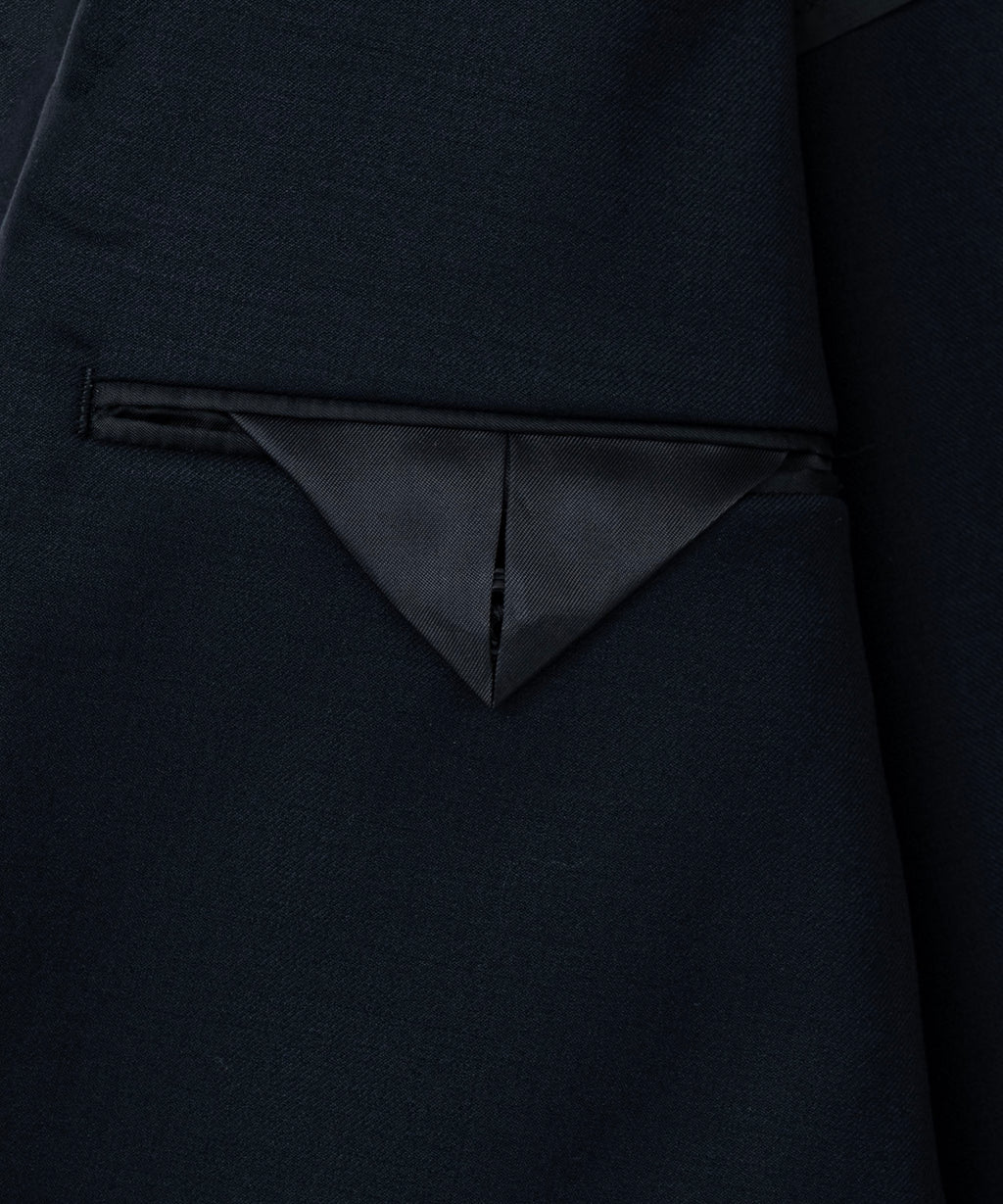 アメリカントラッドの3釦ジャケットをリシェイプ。しなやかで滑らかな光沢感が贅沢なSUPER110ウールとシルクをブレンドした糸を採用した生地を使用。フロント釦の位置を少しずらすことでダブルのジャケットやP-COATの様な雰囲気に仕上げている。オーバーフィットシルエットはラフなトップスにスニーカーと合わせたカジュアルスタイルにも贅沢な印象を与え、シャツ、ネクタイや革靴に合わせたフォーマルなスタイリングにも合わせられる汎用性の高いアイテム。26SB4755、26SB4752と合わせてセットアップとして着用可能。