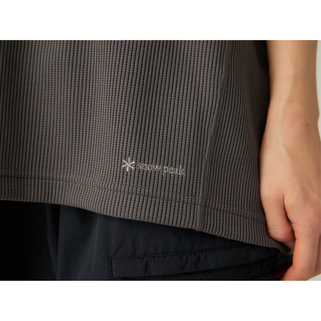 生地は両面ワッフルではなく、裏面のみフラットにすることでソフトな肌ざわりを実現。これにより生地が肌に直接触れる面積が多くなり、素早く汗を吸い上げて表面のワッフル組織に水分を拡散。優れた吸水速乾性を発揮します。
