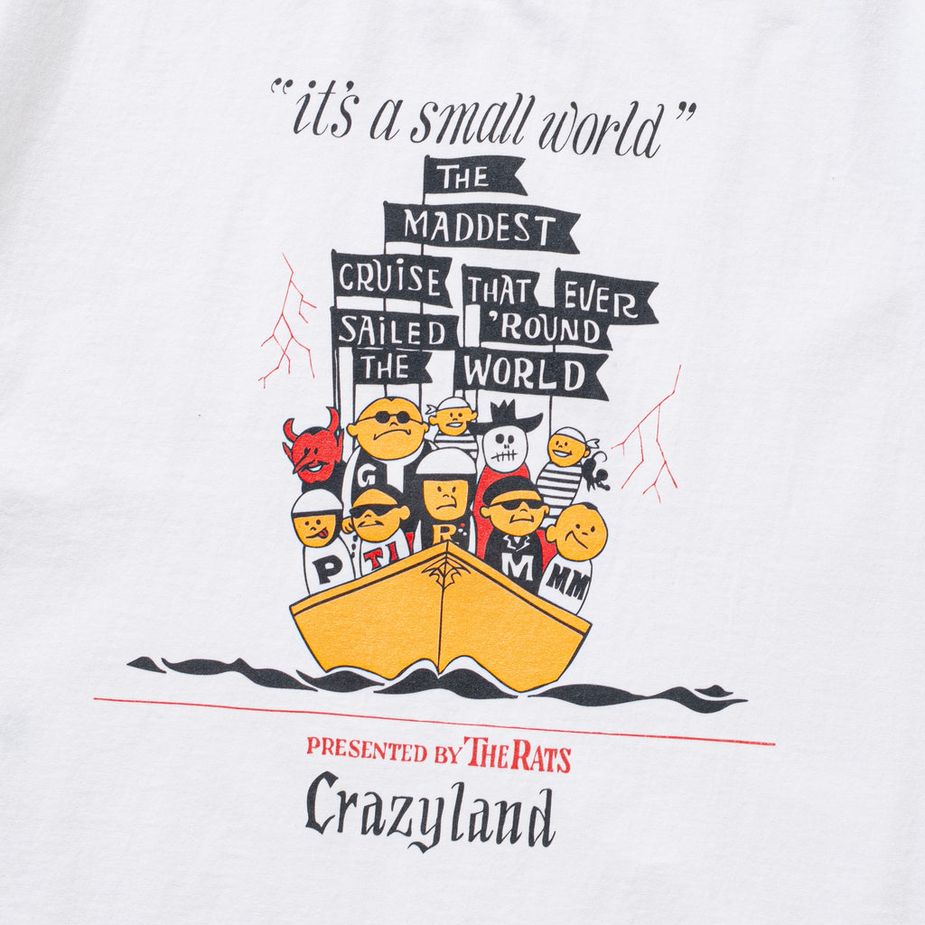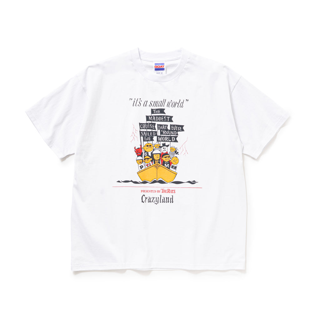 FAMILIA XXでコラボレーションを果たした旧知のメンバー5名とRATS代表眞野を含む6人をFUSTYWORKSが手描きで仕上げたグラフィックと、“It's a small world”に扮した6名のキャラクターが登場するグラフィックを加えた合計7種のショートスリーブTシャツを封入したスペシャルBOXセット。プリントはすべてインクジェットで表現、背面右脇にRatモチーフのワンポイント刺繍。着丈やや短め、身幅にゆとりのあるシルエット。スペシャル仕様のオリジナルBOX入り。