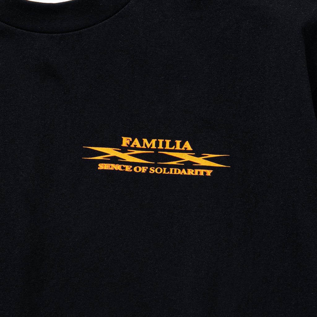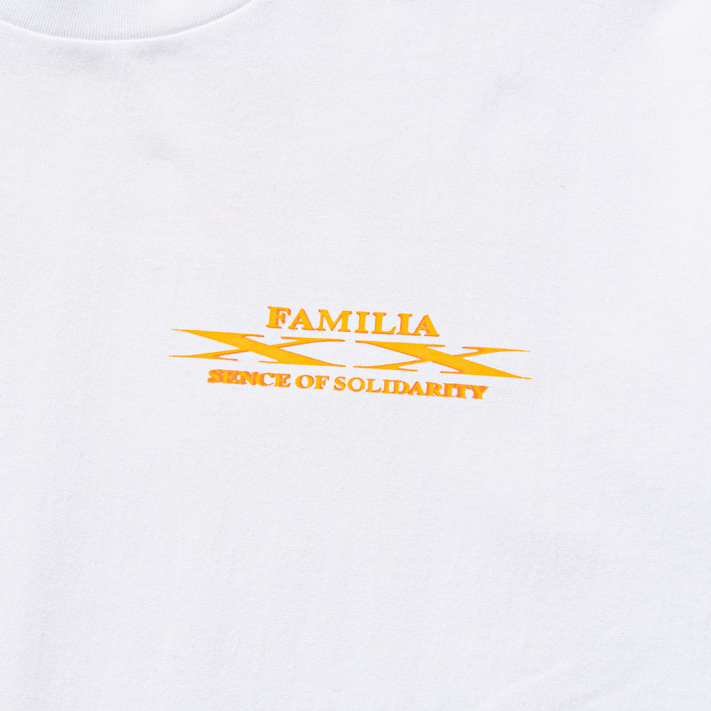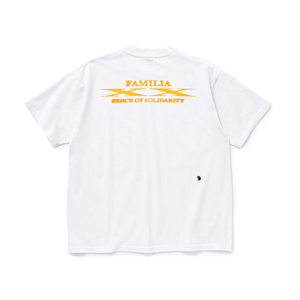 7.0oz、ドライタッチなコットン天竺素材を使用したGOAT製ボディのショートスリーブTシャツ。左胸、背面にはFAMILIA XX・SENCE OF SOLIDARITYのグラフィックをラバープリントで表現したデザイン。背面右脇にRatモチーフのワンポイント刺繍。着丈やや短め、身幅にゆとりのあるシルエット。