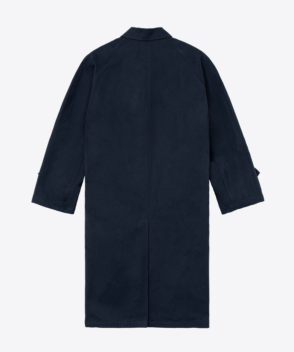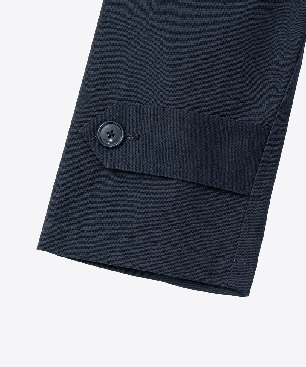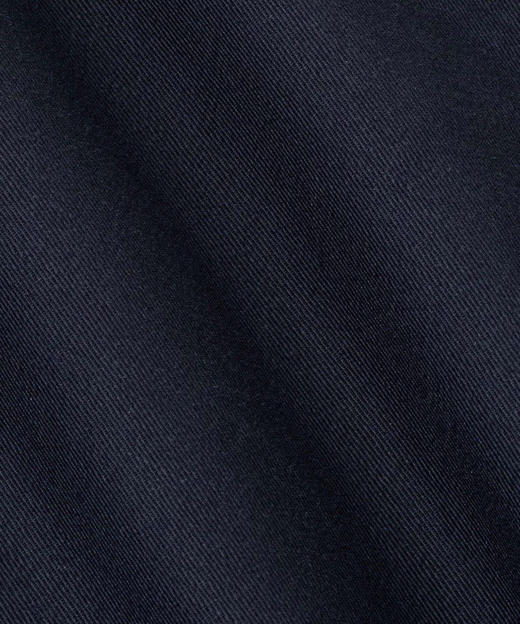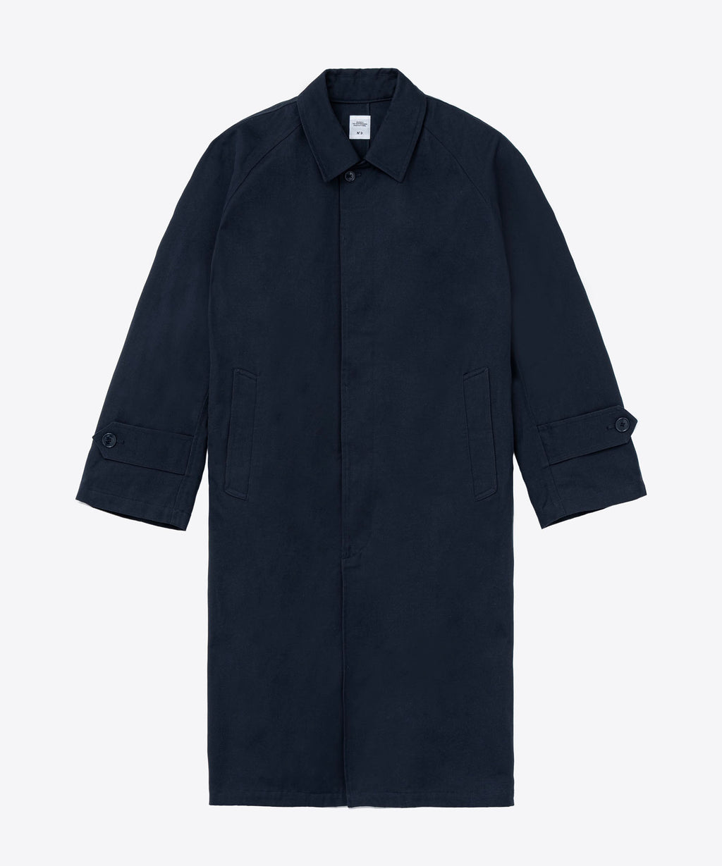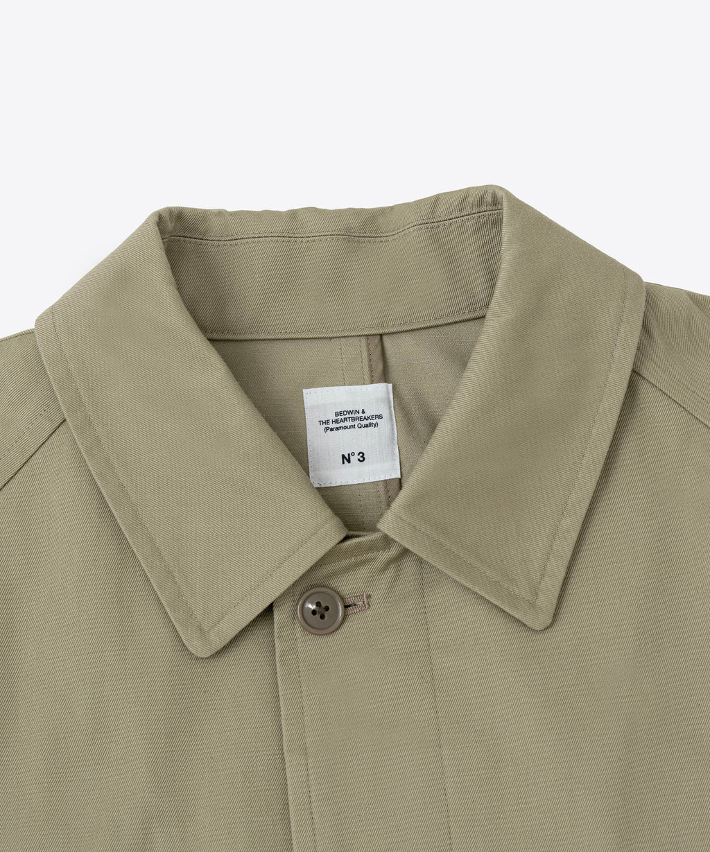 1940年代初期の米軍タンカージャケットに使用をされていたようなツイル生地を採用。特殊な染めを施すことで洗濯堅牢度がよく、摩擦によって色が少しずつ落ちていくので、より長くエイジング感を感じられる汎用性の高いシンプルなコートに仕上げている。センターベントに配置した共地ループタブが特徴。身幅、袖幅を少し大きくとったビッグシルエット。
