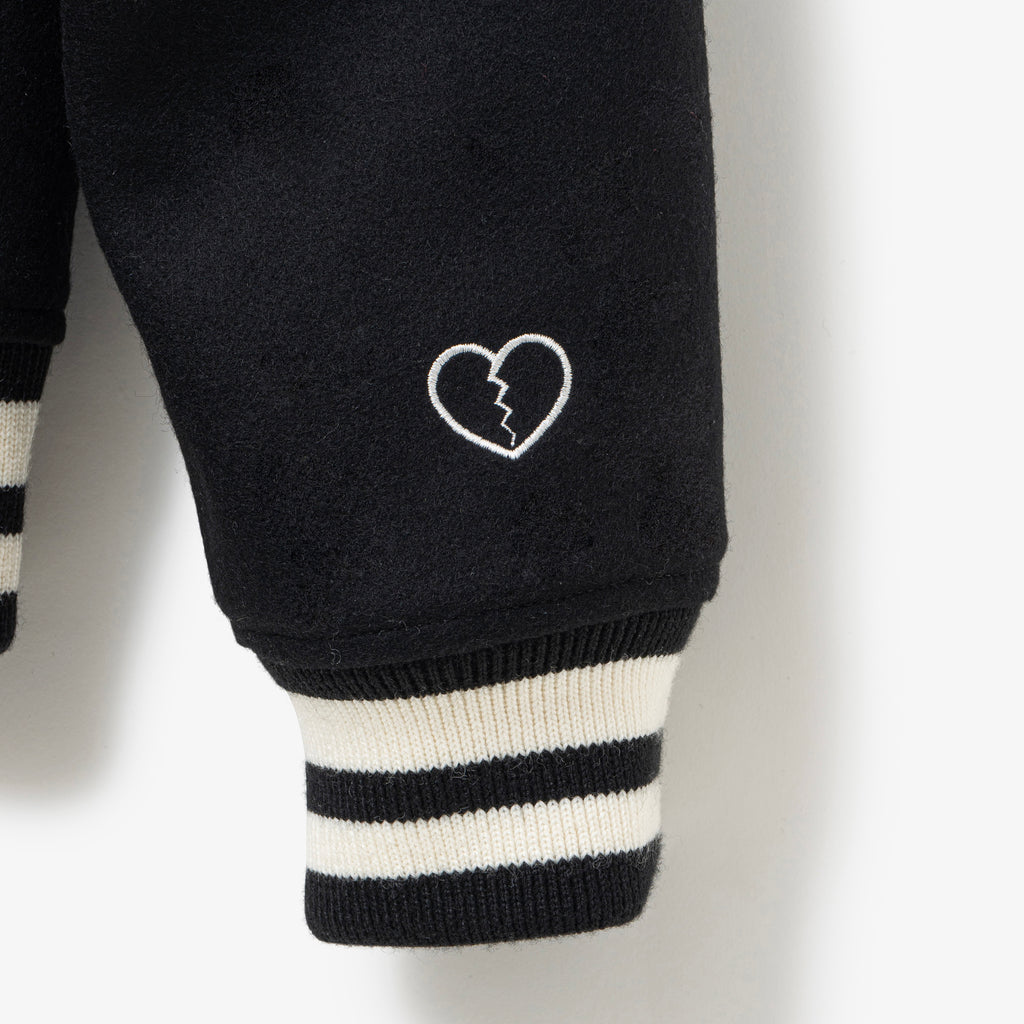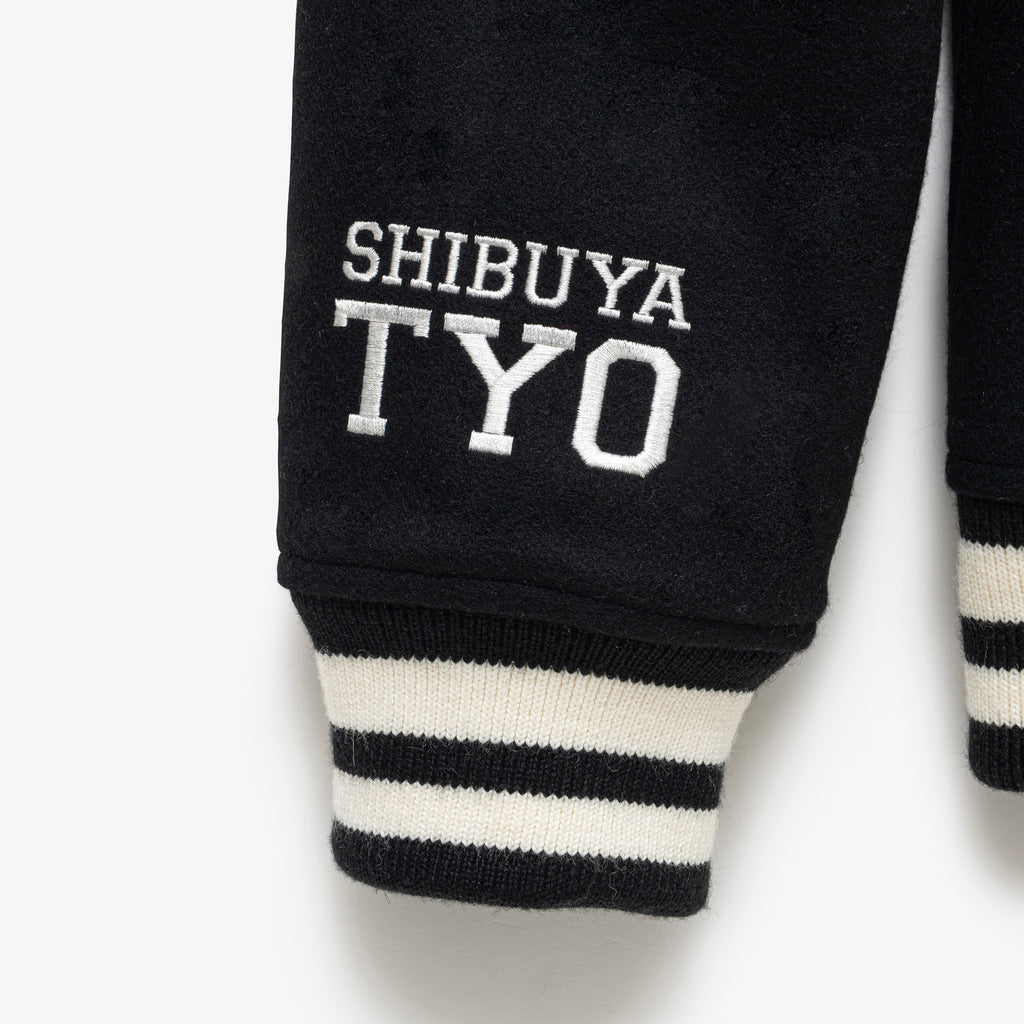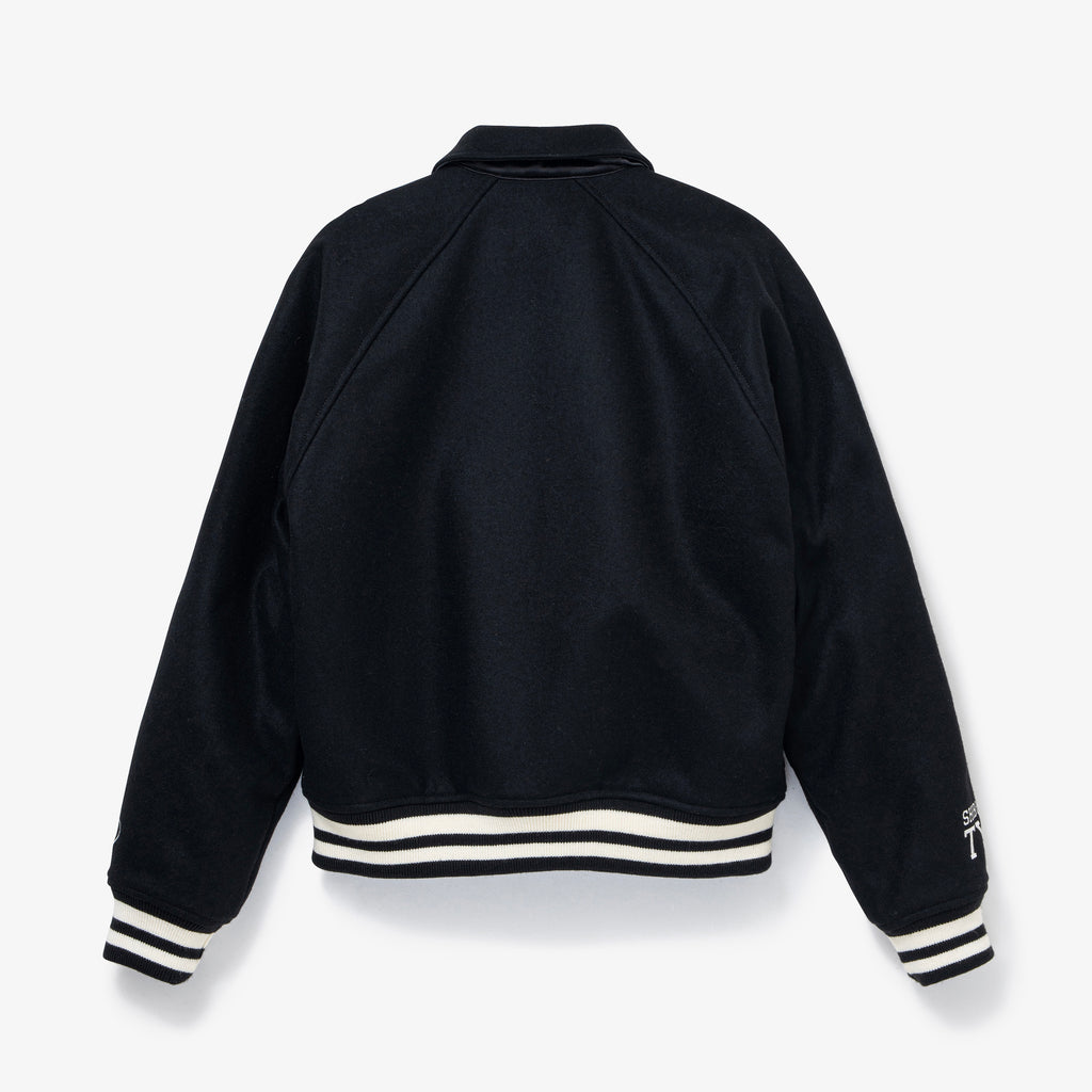 BEDWIN定番アイテムの一つアワードジャケットを今季はさらに着丈を短くすることで90年代のストリートの雰囲気を纏わせ、リバーシブル仕様に昇華。中肉厚なウールナイロンのメルトンを表に使用し、胸に大きくブランドロゴをフェルトワッペンで表現。左右の袖にはワンポイントの刺繍を配置。裏側は若干ストレッチ性のあるサテン生地を使用し、身頃と袖を配色にしている。左胸にワンポイントの刺繍を配置。