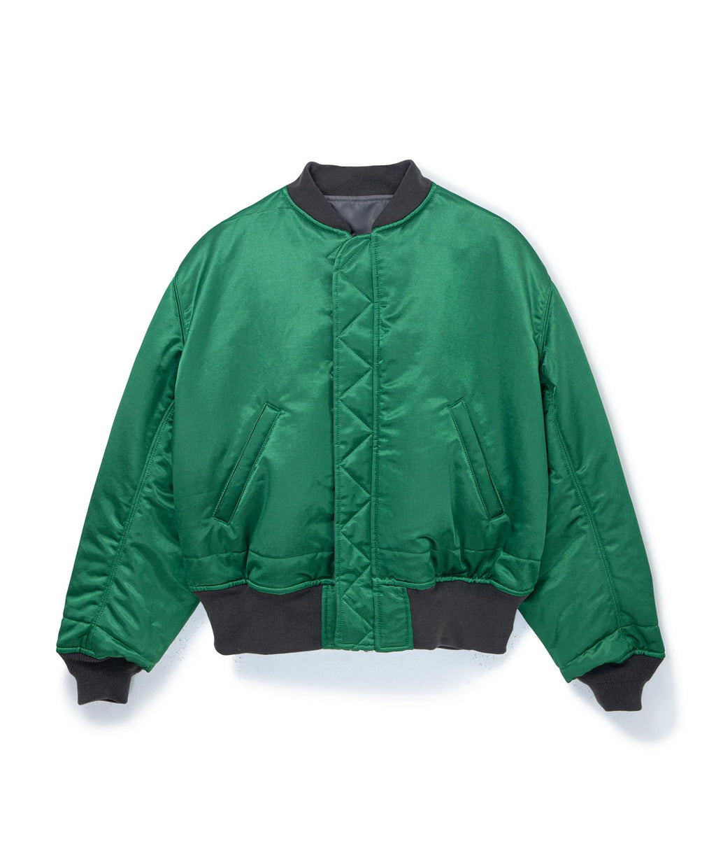 環境にやさしいリサイクルナイロンに、フッ素フリーの撥水加工『C-ZERO撥水』を施したとことんサスティナブルな素材を表側に採用。裏側にはスカジャンなどに使用される中肉の光沢のあるサテン生地を採用。本体に中わたを入れることで防寒性を確保。身幅を広くし、あえて極端に着丈を短めにすることで独特のフォルムを表現。