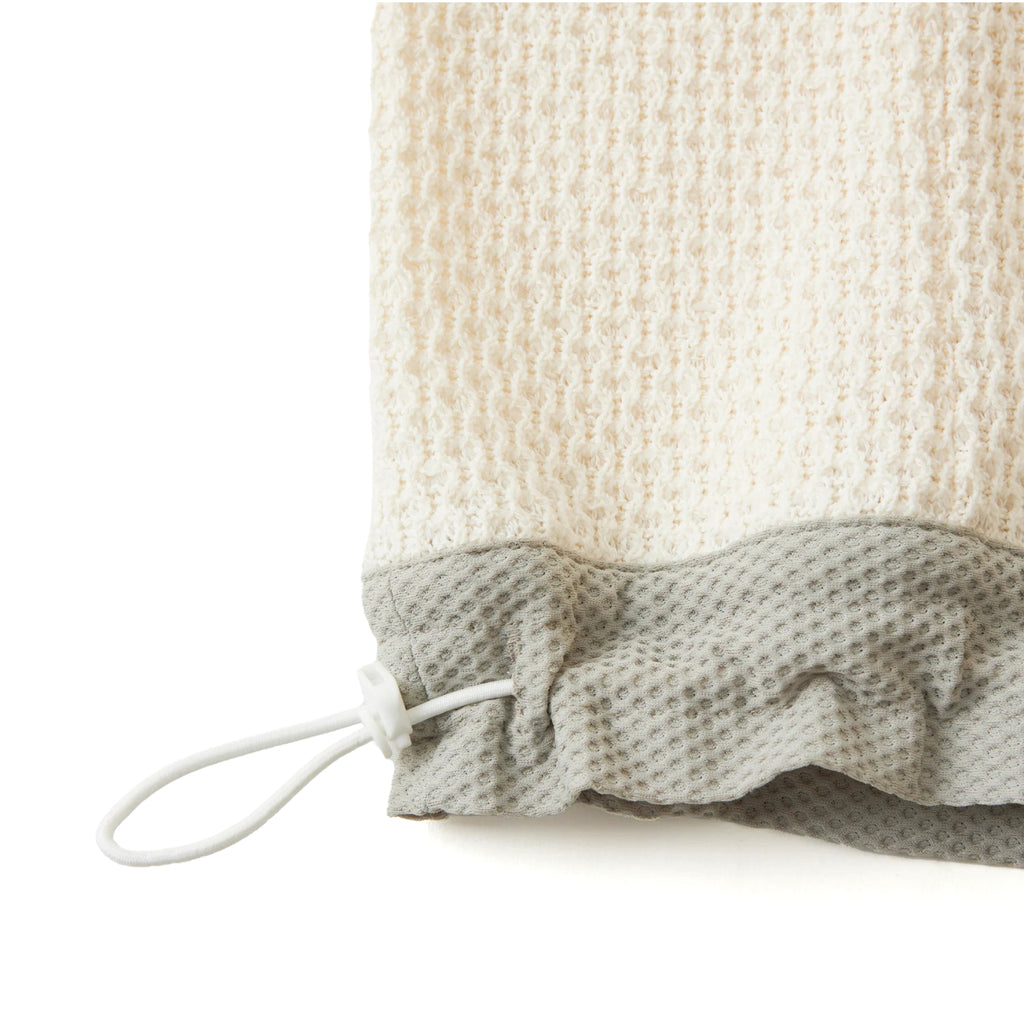 ・袖口に平ゴムを入れフィット感を出し、裾に通したスピンドルで調節が可能。