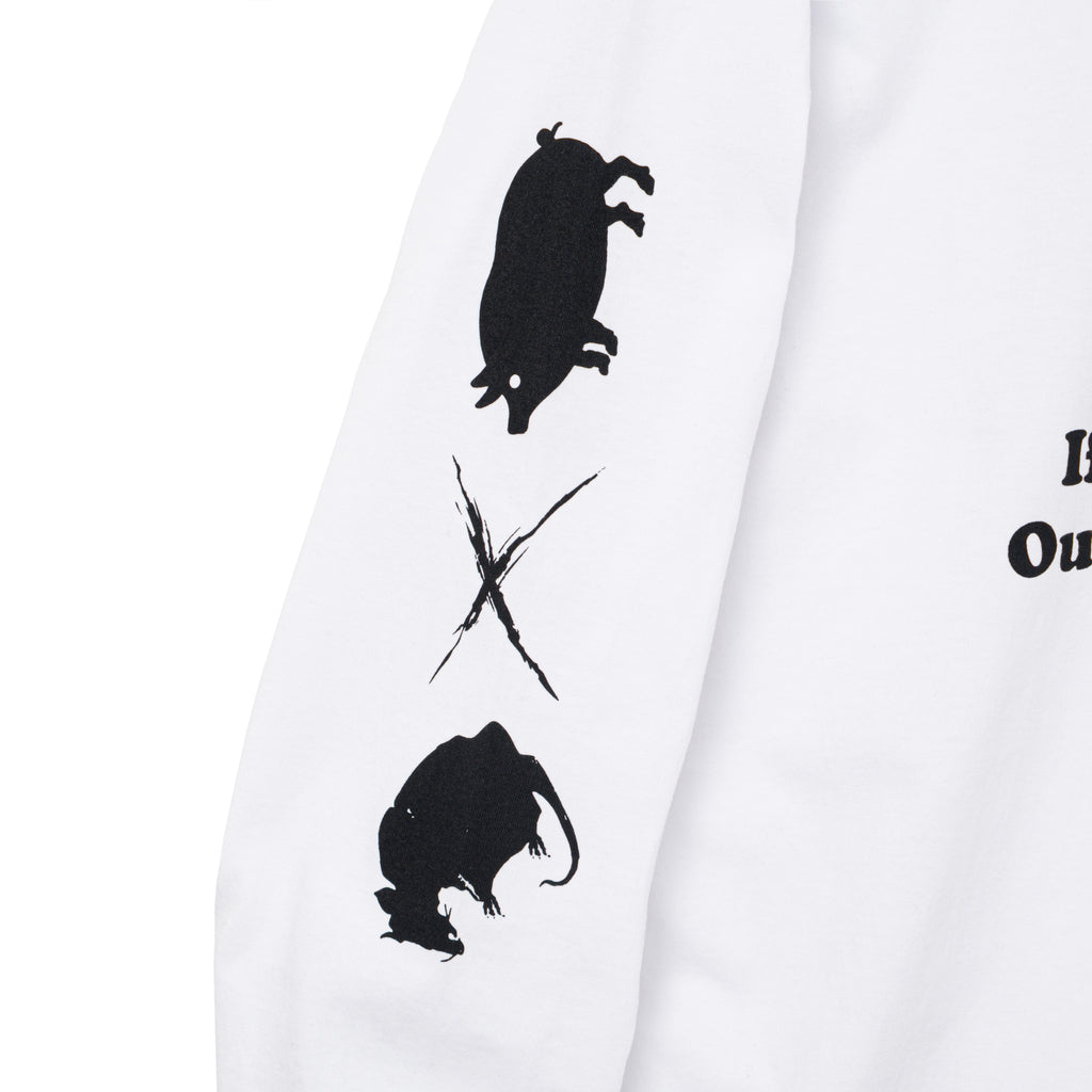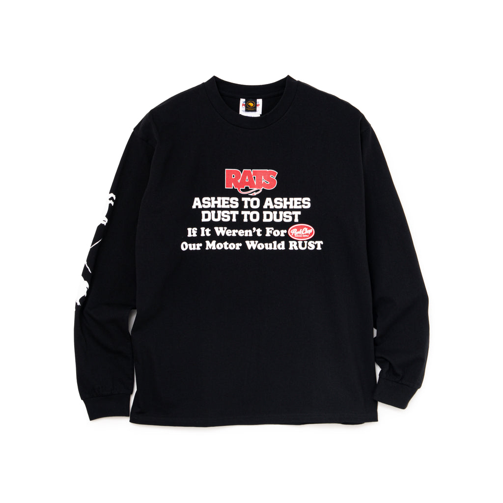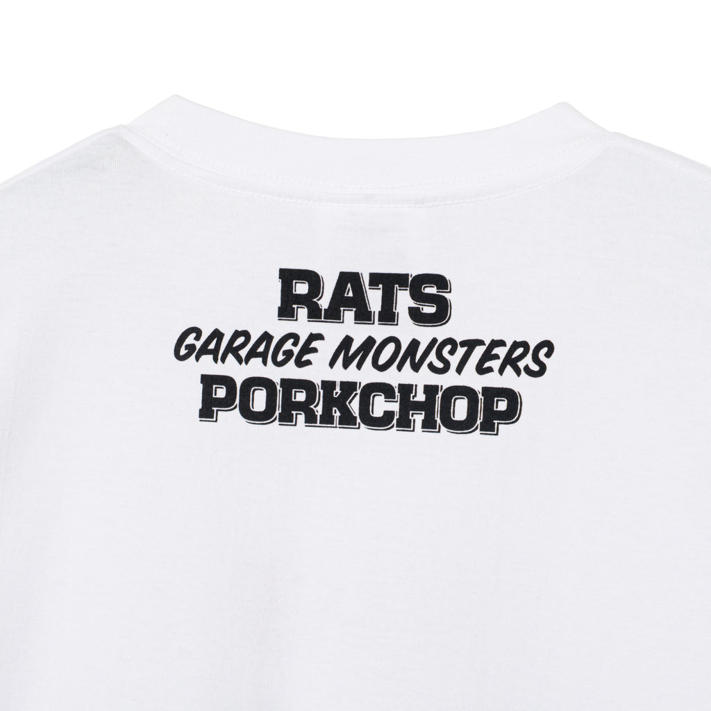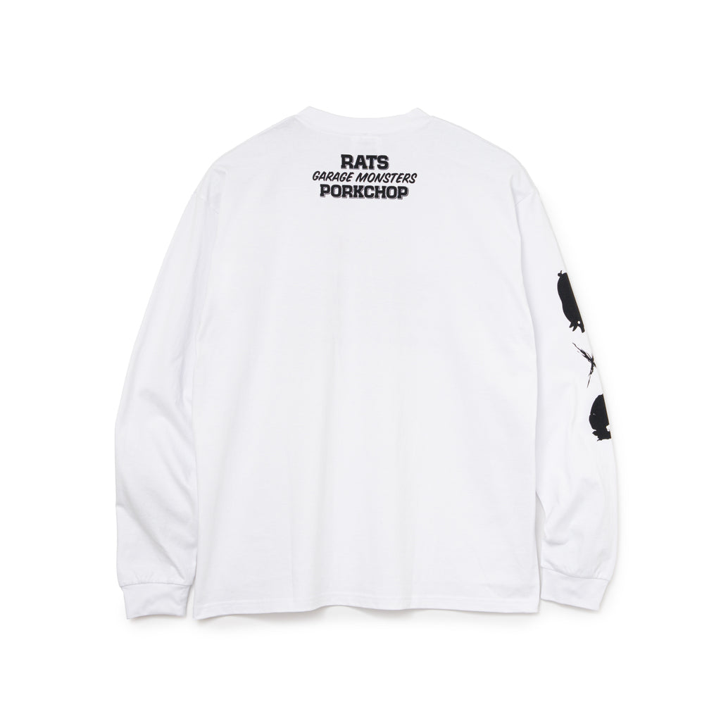 7.0oz、ドライタッチなコットン天竺素材を使用したGOAT製ボディのロングスリーブTシャツ。フロントにRATSボックス型ロゴ、コラボレーションのコンセプトを明記したレターグラフィック、背面に2ブランドのロゴ、右袖にRatモチーフ・Pigモチーフをラバープリントで表現したデザイン。背面右脇にRatモチーフのワンポイント刺繍。着丈やや短め、身幅にゆとりのあるシルエット。2色4サイズ展開。<PORKCHOP GARAGE SUPPLY>とのコラボレーションモデル。