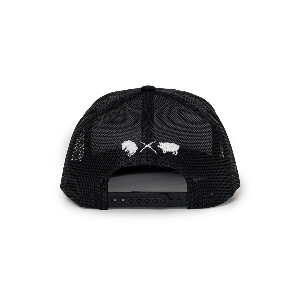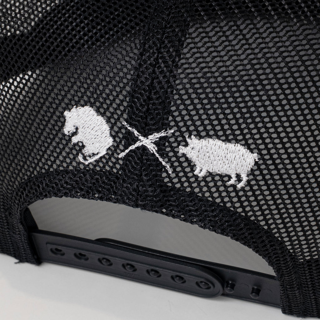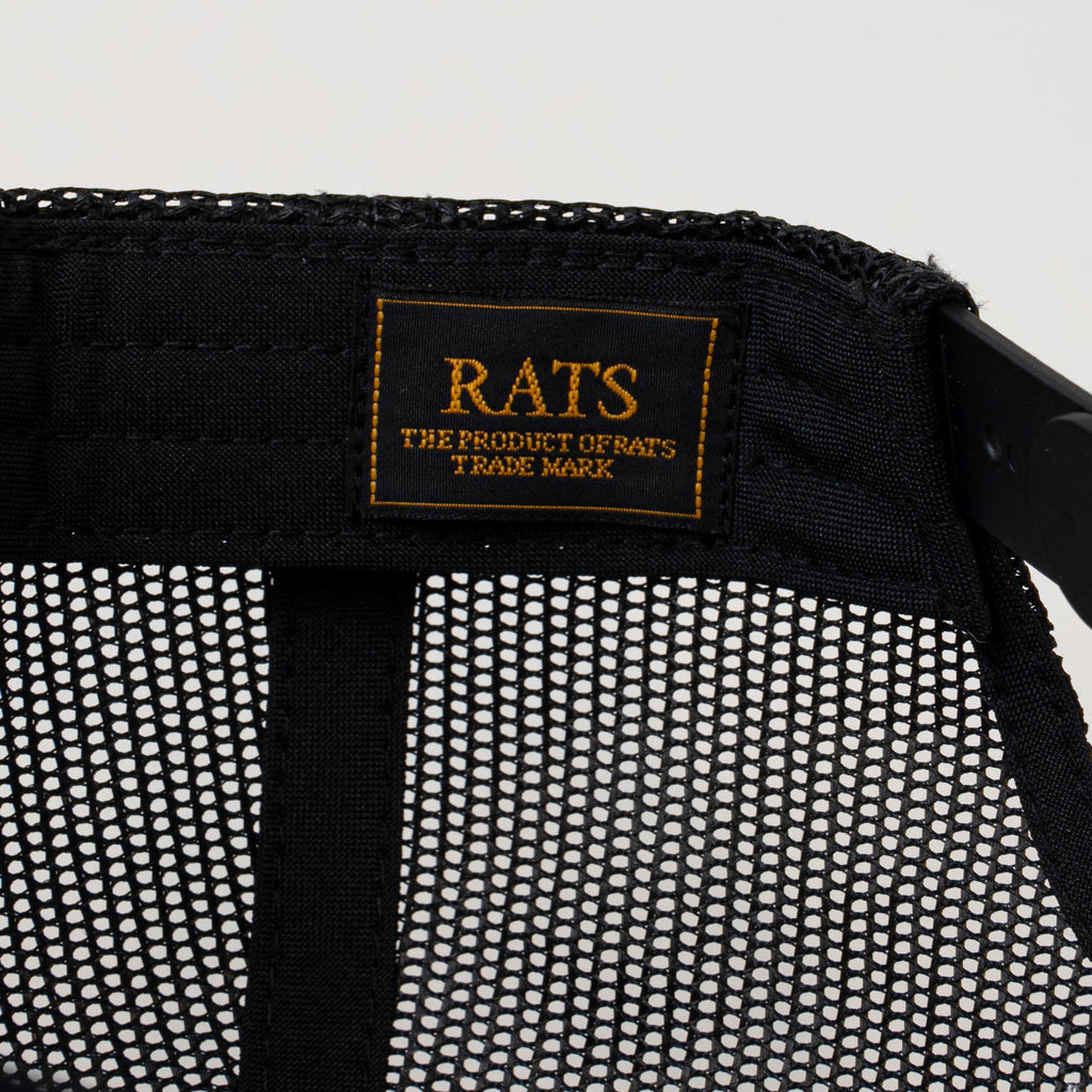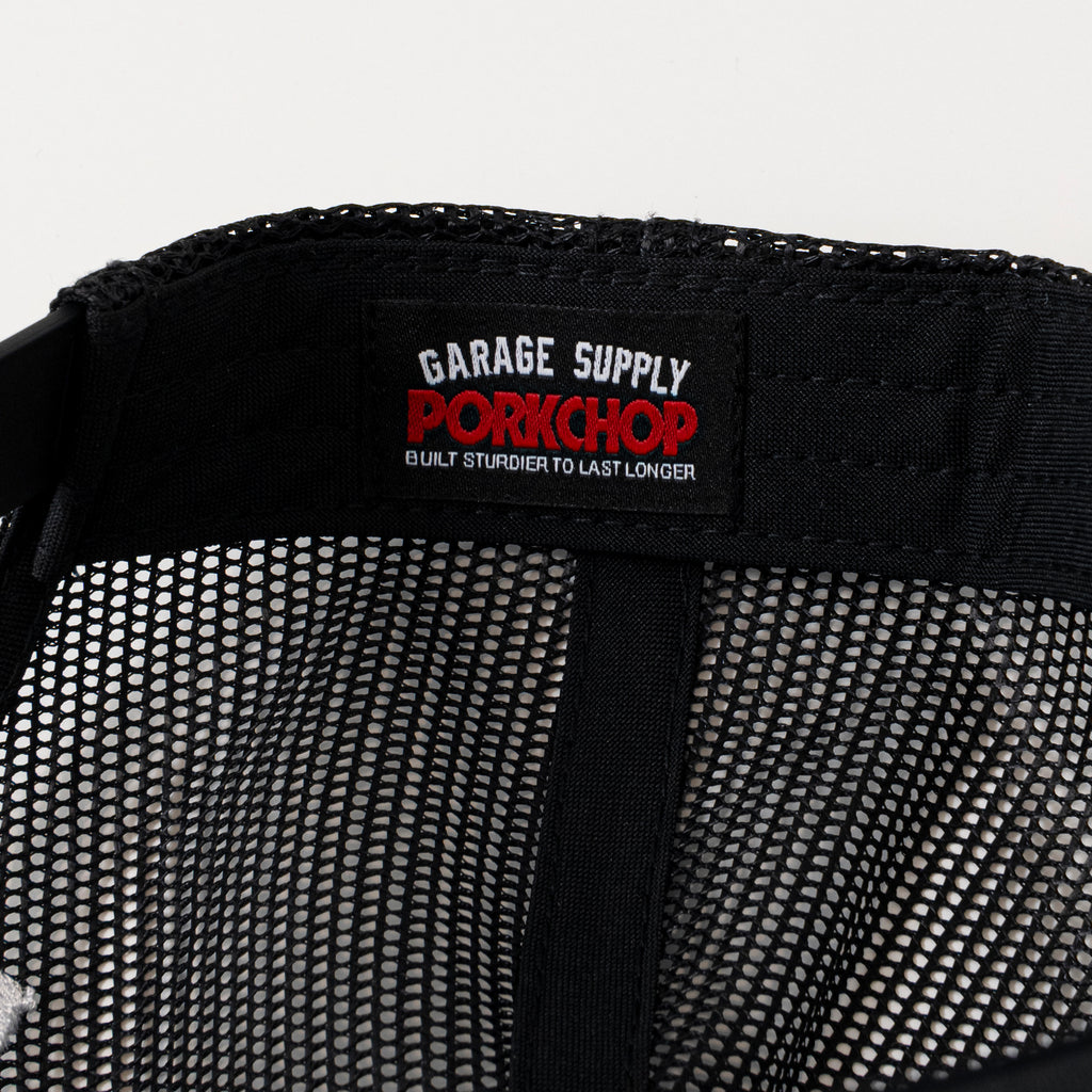 ハイクラウン、ファットバイザー型のメッシュキャップ。フロントパネルに刺繍入りフェルトワッペン、後部メッシュにRatモチーフ・Pigモチーフを刺繍で表現したデザイン。後部中央にスナップバックを付属、サイズ調整が可能な仕様。1色1サイズ展開。<PORKCHOP GARAGE SUPPLY>とのコラボレーションモデル。